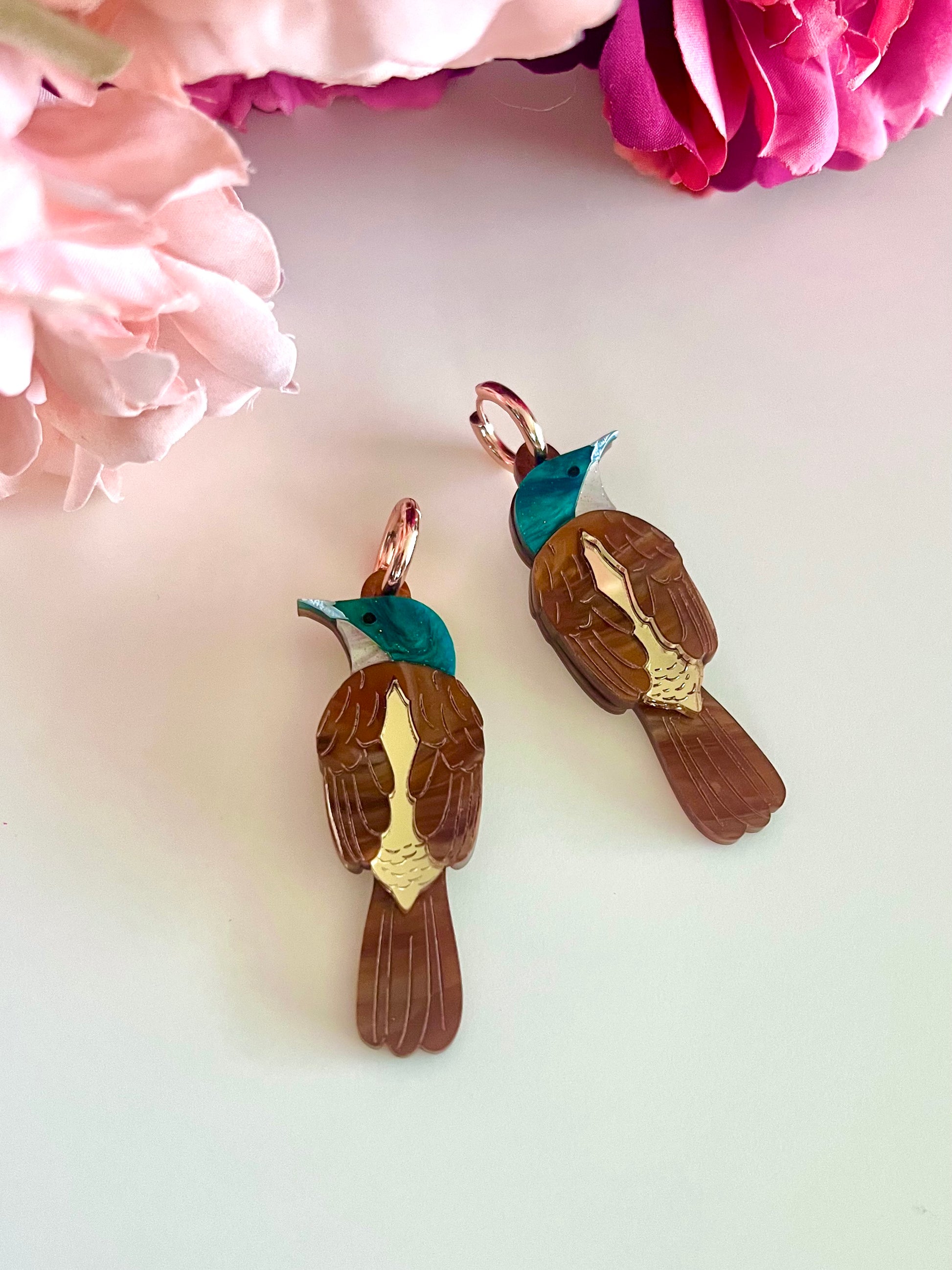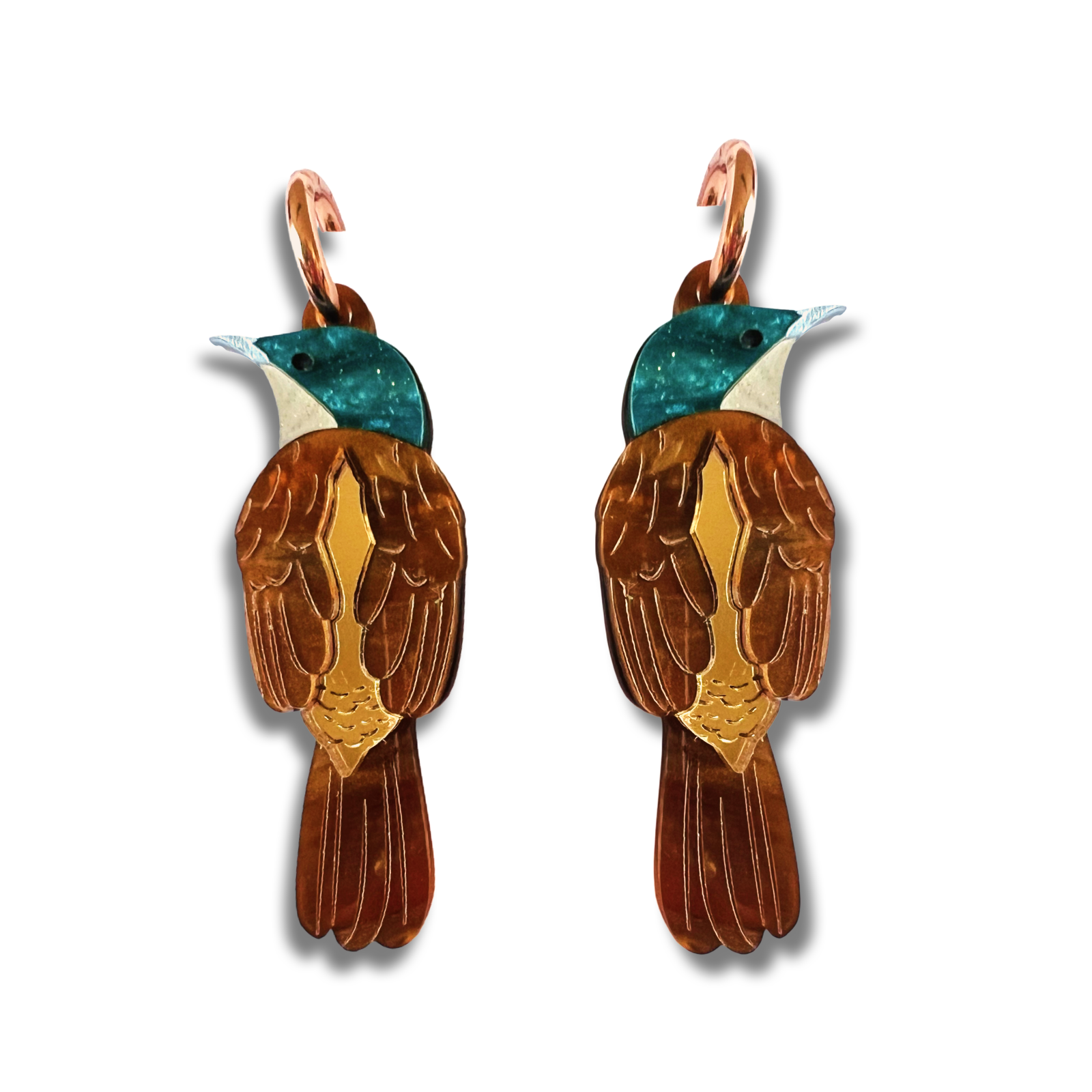 A marble warm brown silhouette in mid-flight - a shimmer of gold. These hoops capture the quiet glamour of rainforest motion.