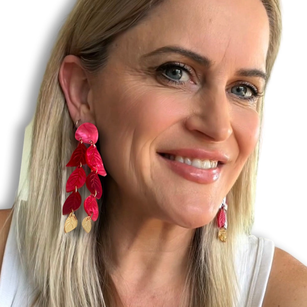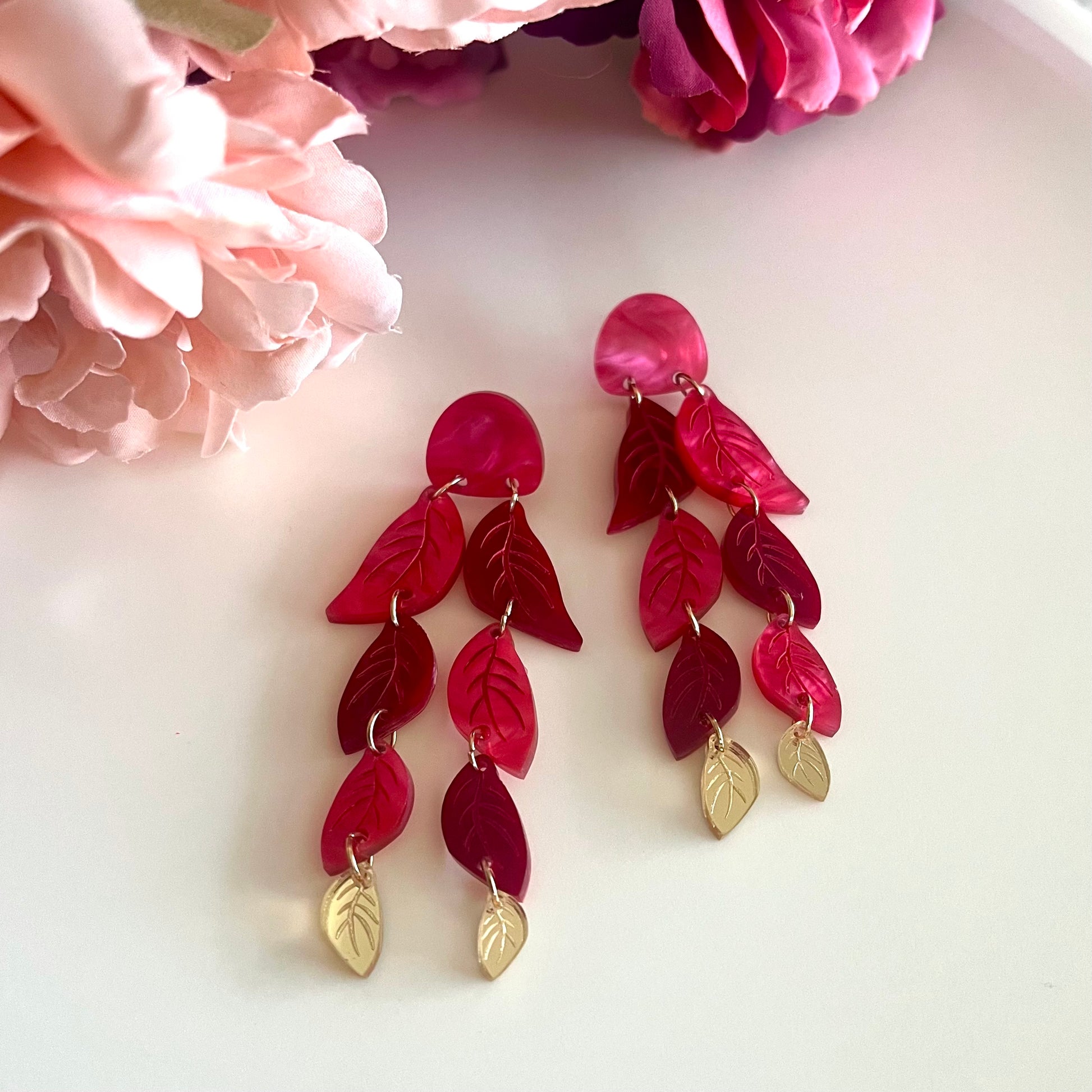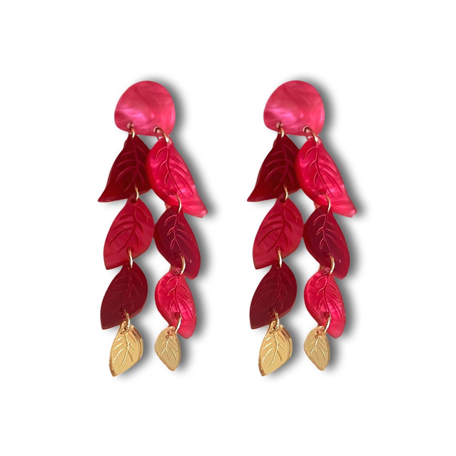 Cascading layers of pearl pink and ember red, like forest leaves descending through warm afternoon air.