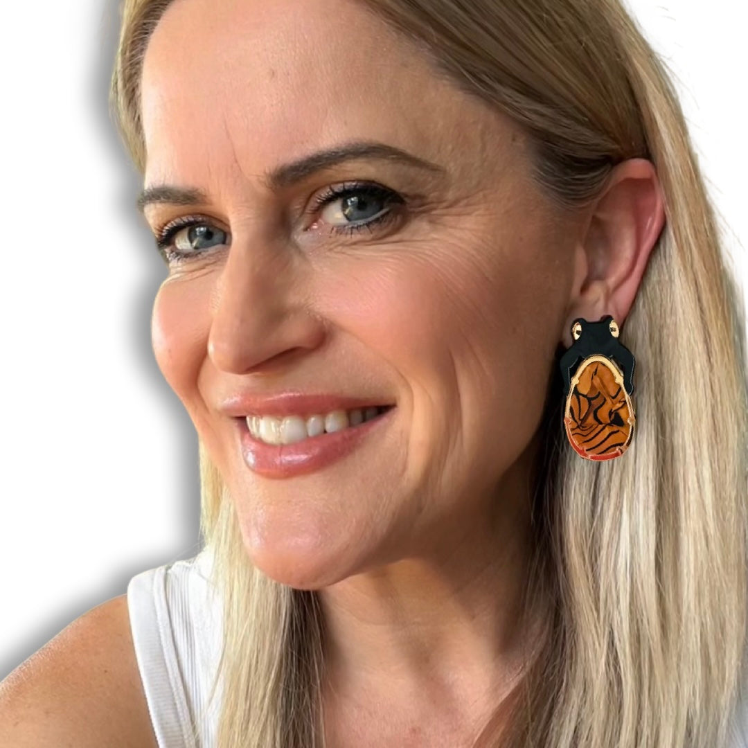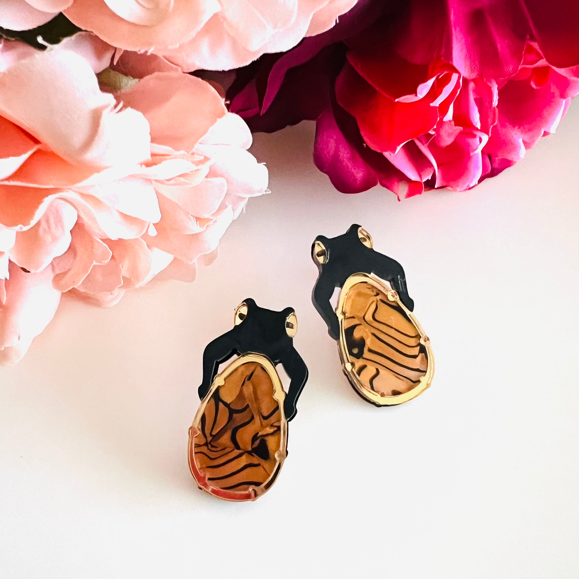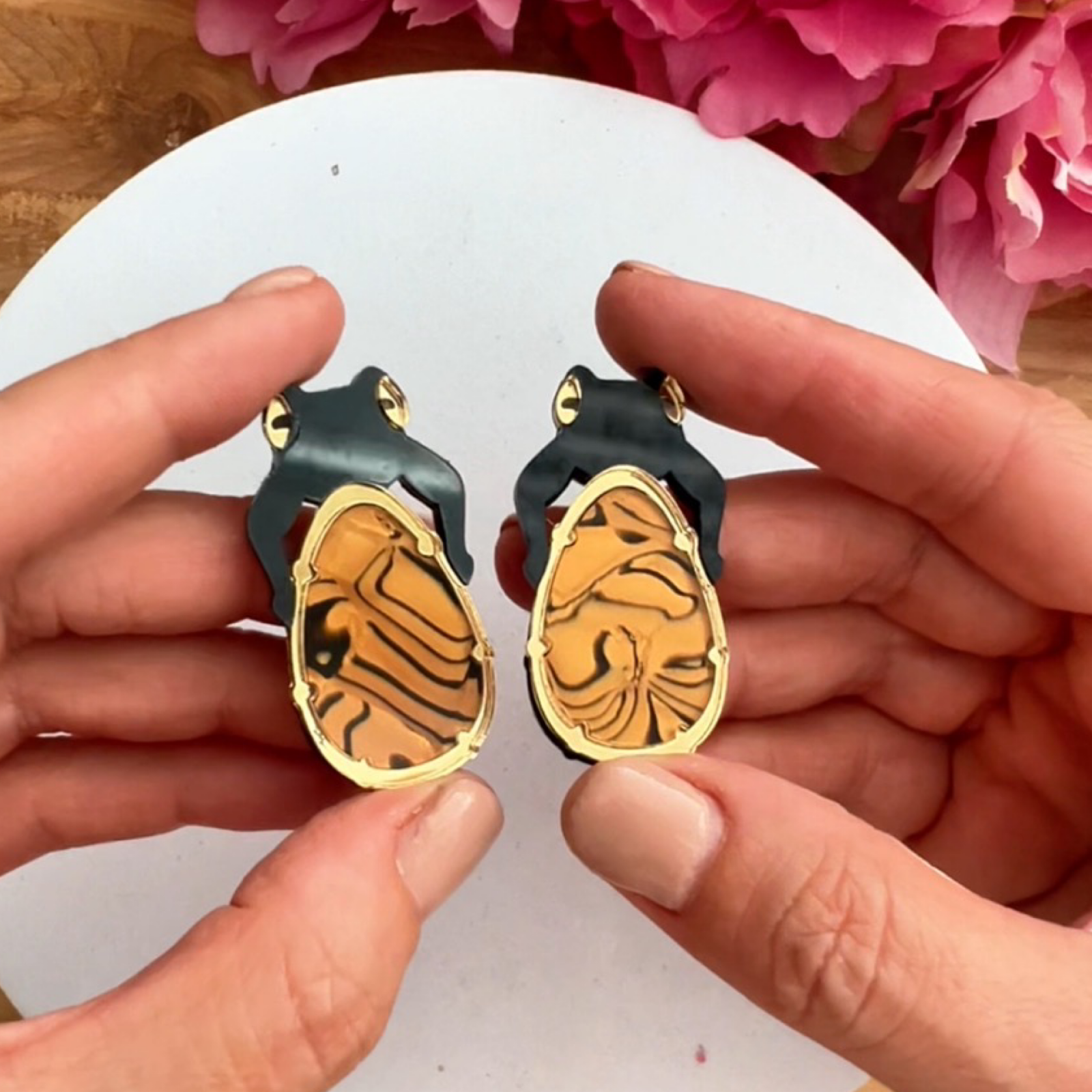 A little frog, carved in tigers eye stone-toned acrylic with an Art Deco twist. Earthy, glamorous and a bit whimsical.