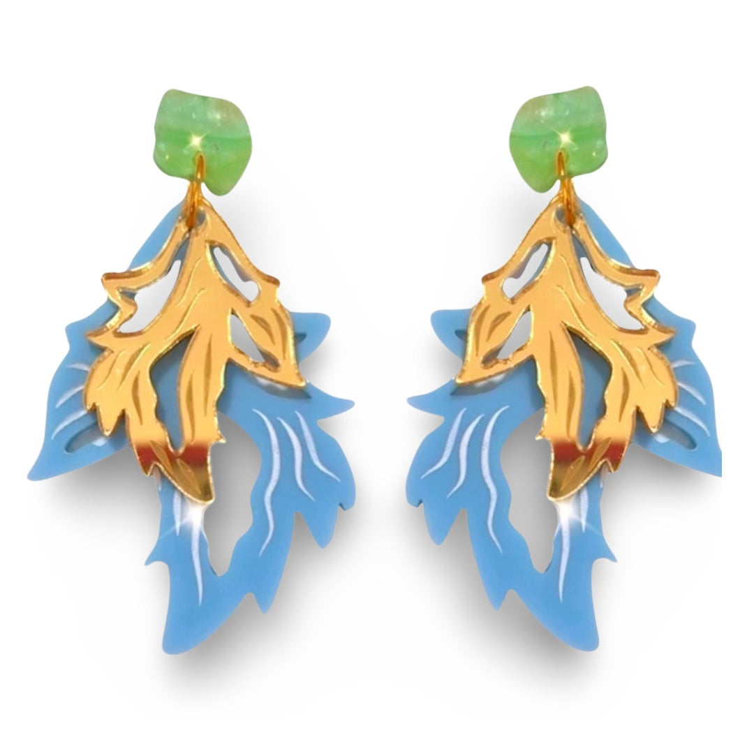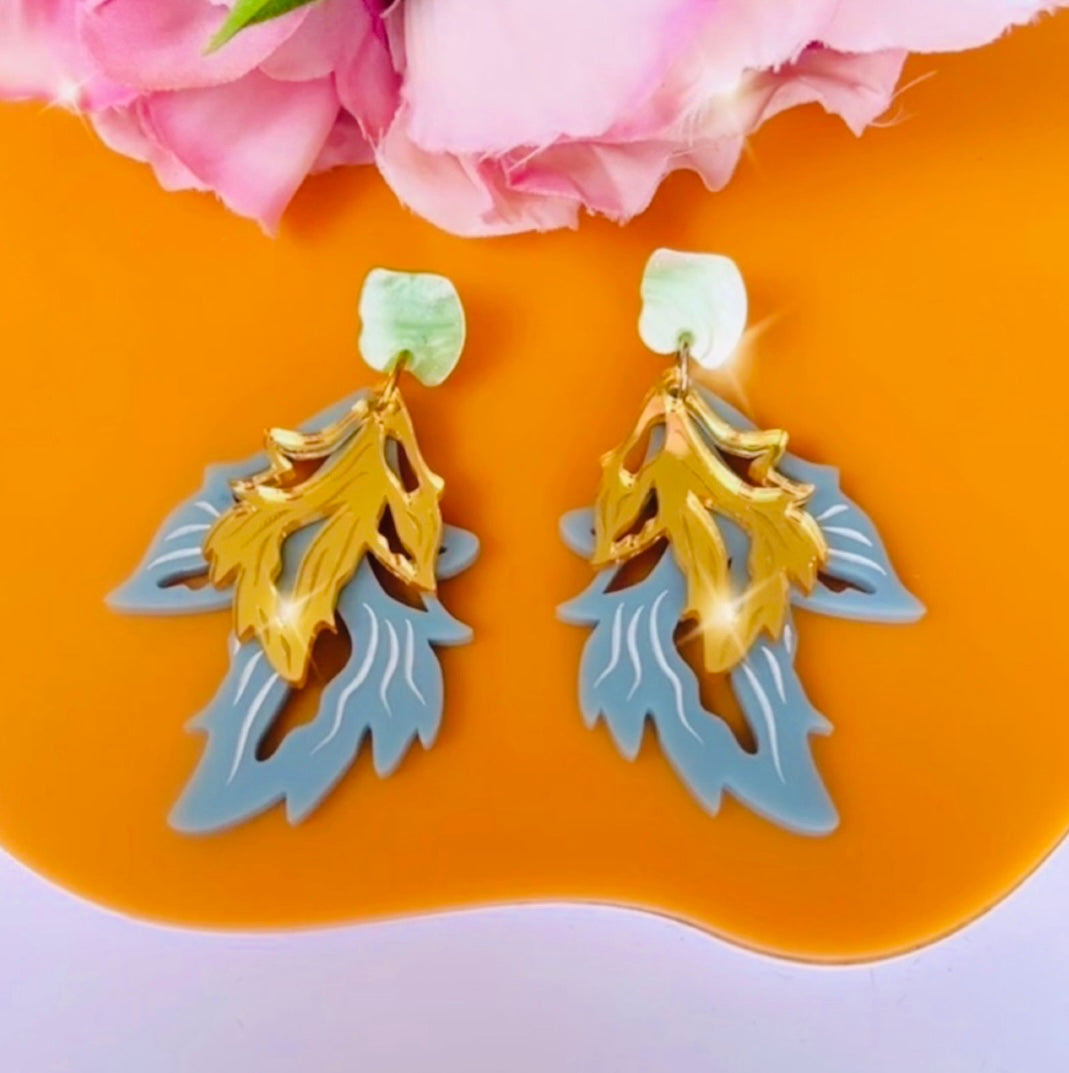 Indulge in the beauty of a statement leaf earring adorned with subtle blue and green tones, each leaf intricately designed to evoke the essence of nature. A pop of golden shimmer adds a touch of sophistication, catching the light with every movement. Wearing these earrings, you embody a harmonious blend of organic elegance and a hint of luxurious allure, making a statement that effortlessly transitions from day to night.