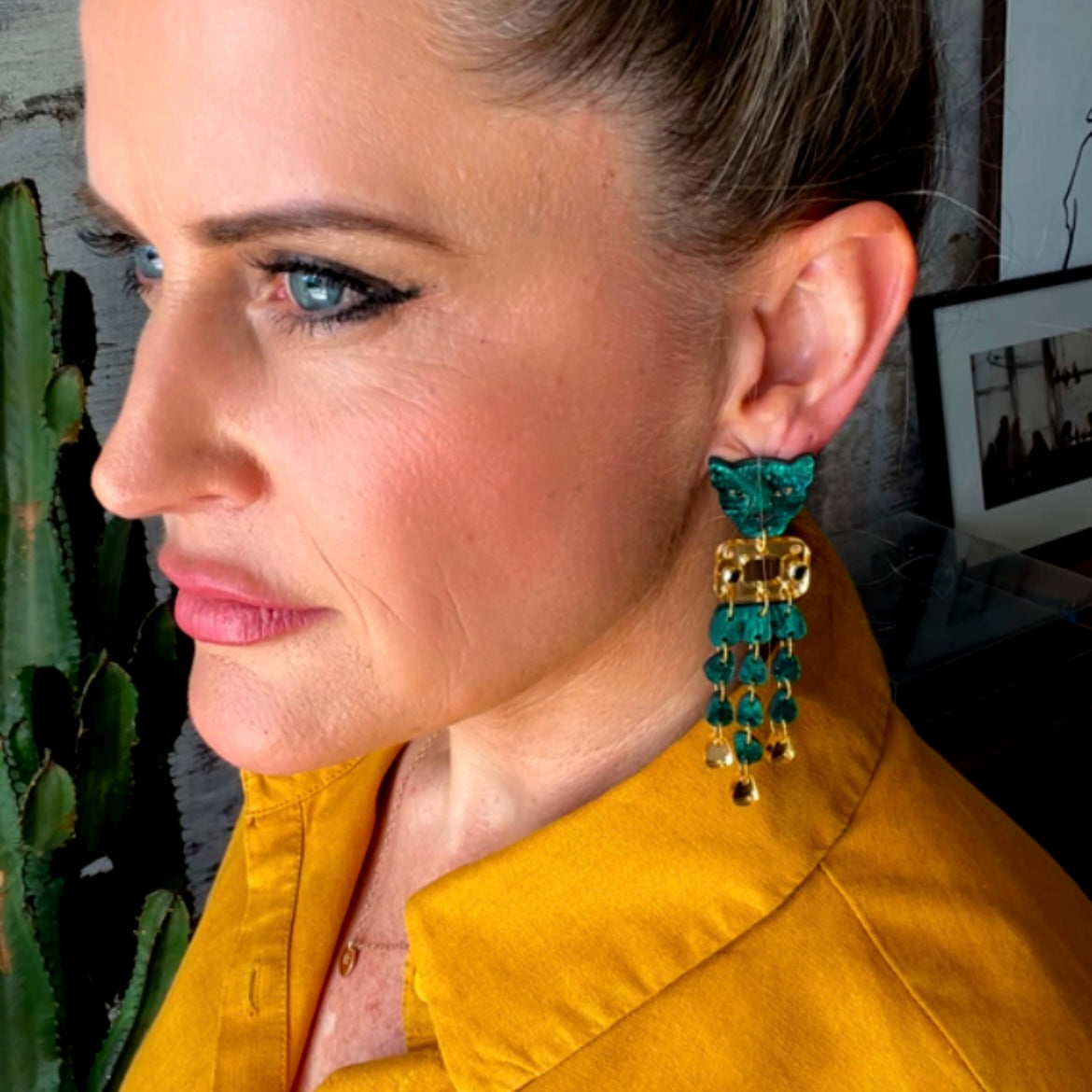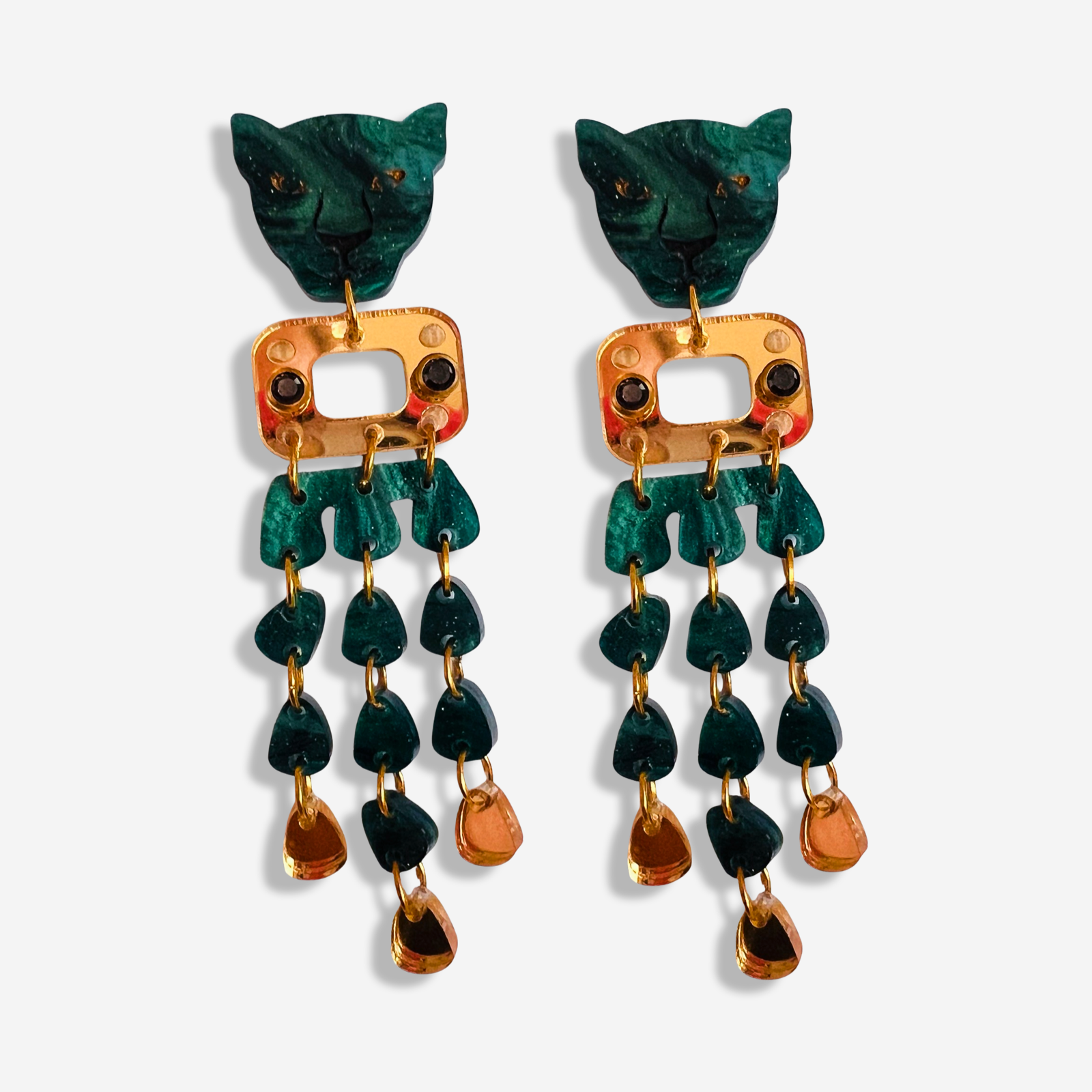 The panther's face in this design, reflects the intense gaze, while the golden and black chandelier dangles add that little extra pizazz.